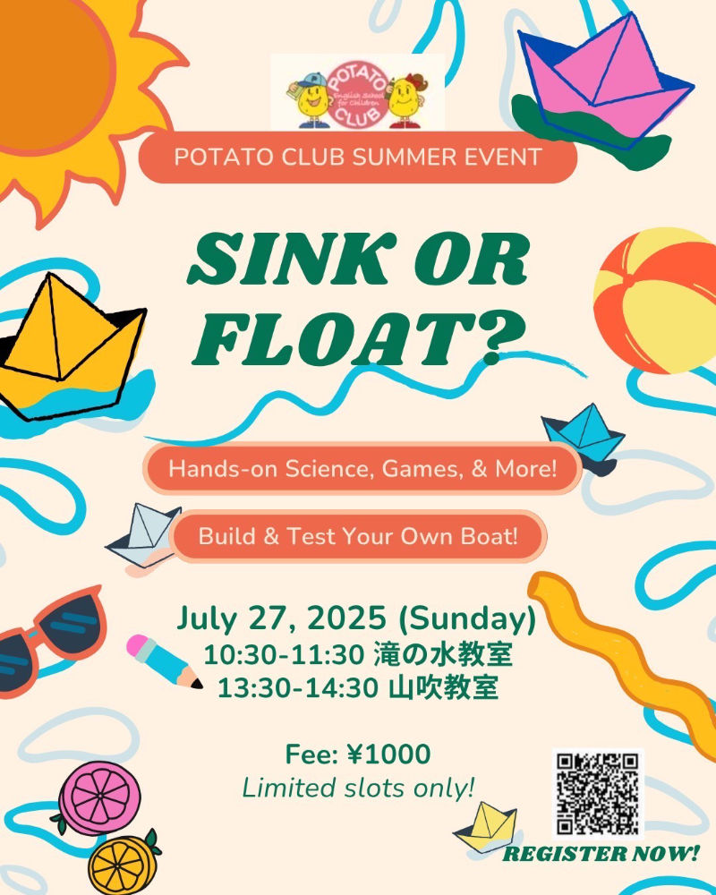 楽しいサイエンスレッスン! ☆浮いたり沈んだり、実験しよう ☆楽しい船を作って競争しよう 7/27日曜日 滝ノ水教室10:30-11:30 山吹教室13:30-14:30 他教室からのご参加も受け付けております。 参加費1000円