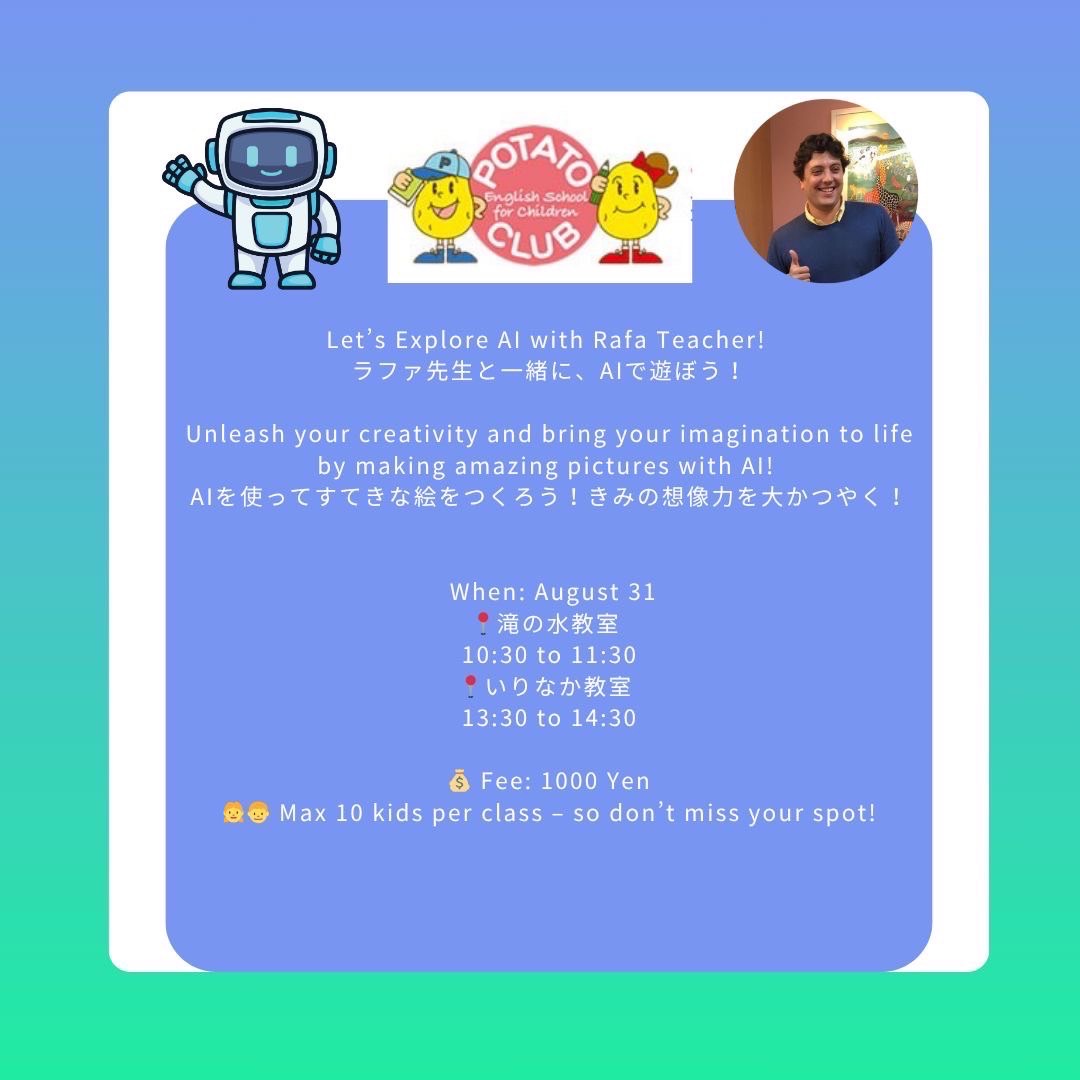 いよいよ明日は夏休み最終日、暑さを吹き飛ばそう! 「Rafa先生とJack先生とAIで遊ぼう」レッスンがあります。 滝ノ水教室 10:30-11:30 いりなか教室 13:30-14:30 参加費1000円 あと数名参加可能です。 他の教室からのご参加もお待ちしております。 Let’s Enjoy an especial AI class with Rafa Teacher and Jack Teacher. Let’s make AI pictures! Come and join us!