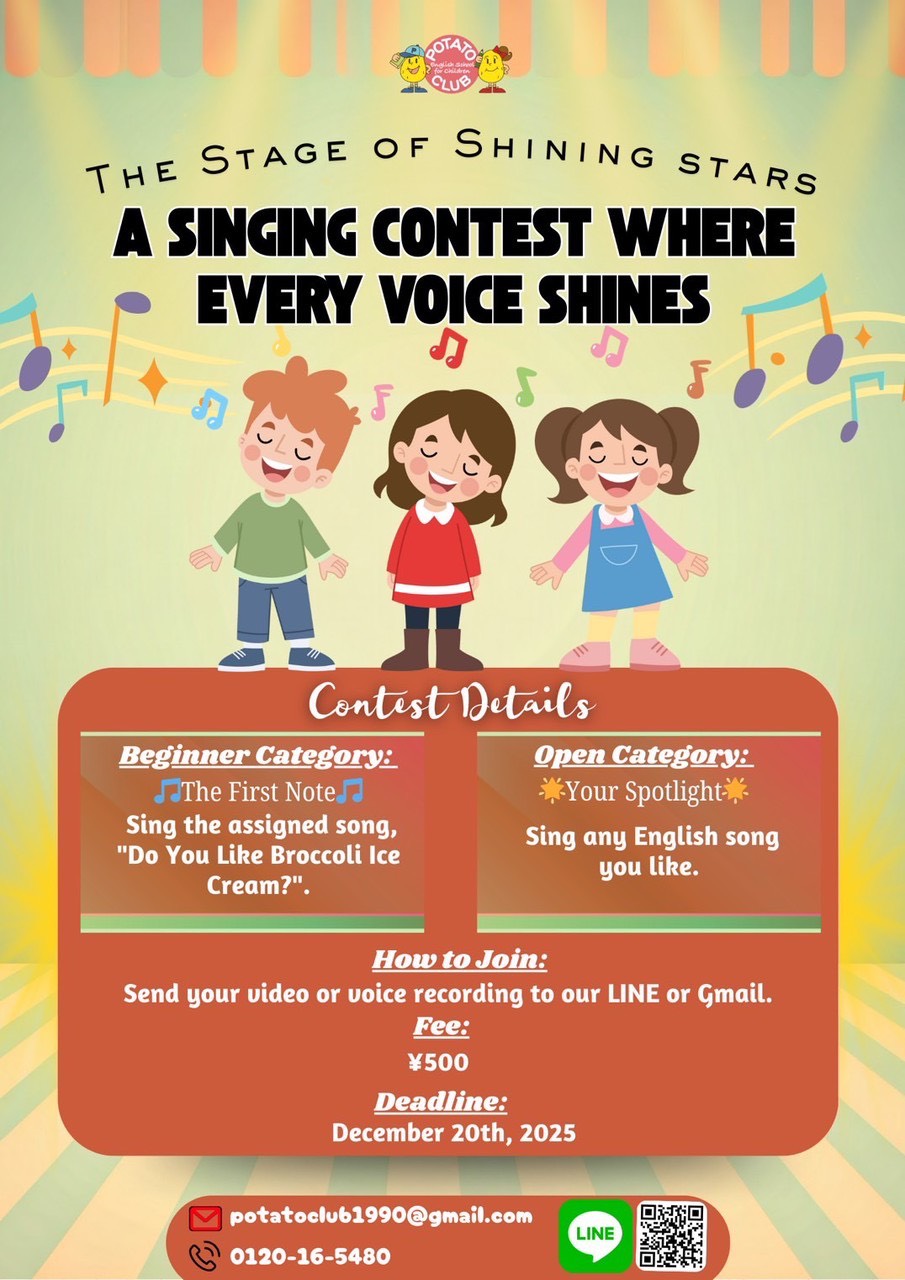 動画を撮ったら、参加者氏名・教室名・学年(年齢)・曲名を明記の上、ポテトクラブの公式ライン または、potatoclub1990@gmail.comに送ってください。