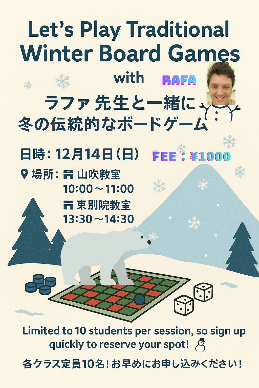 お知らせ 12月14日(日) ラファ先生と一緒に冬の伝統的なボードゲーム 日時: 12月14日(日) 料金: ¥1000 場所: 山吹教室 10:00~11:00 東別院教室 13:30〜14:30 各クラス定員10名!お早めにお申し込みください! 東別院教室|いりなか教室|味鋺教室|山吹教室|滝ノ水教室 体験レッスンのお申し込み お子様に合ったスクールかどうか確かめてみてください。